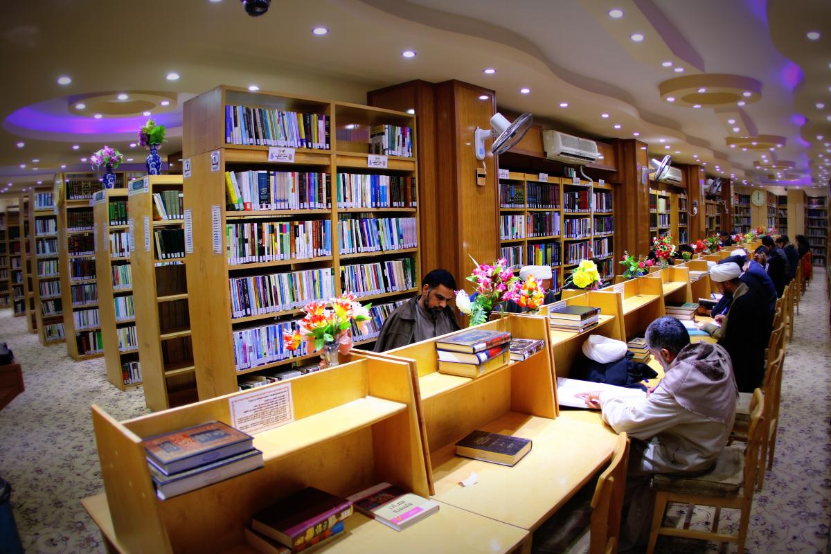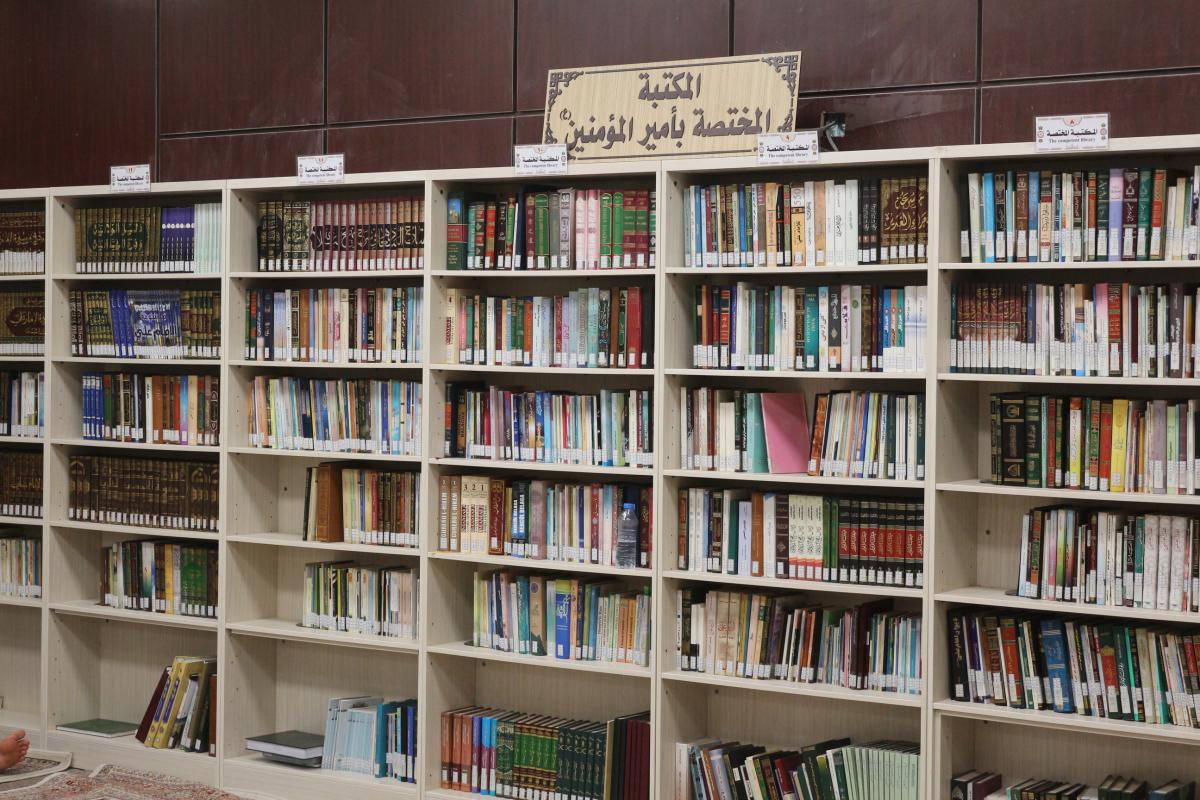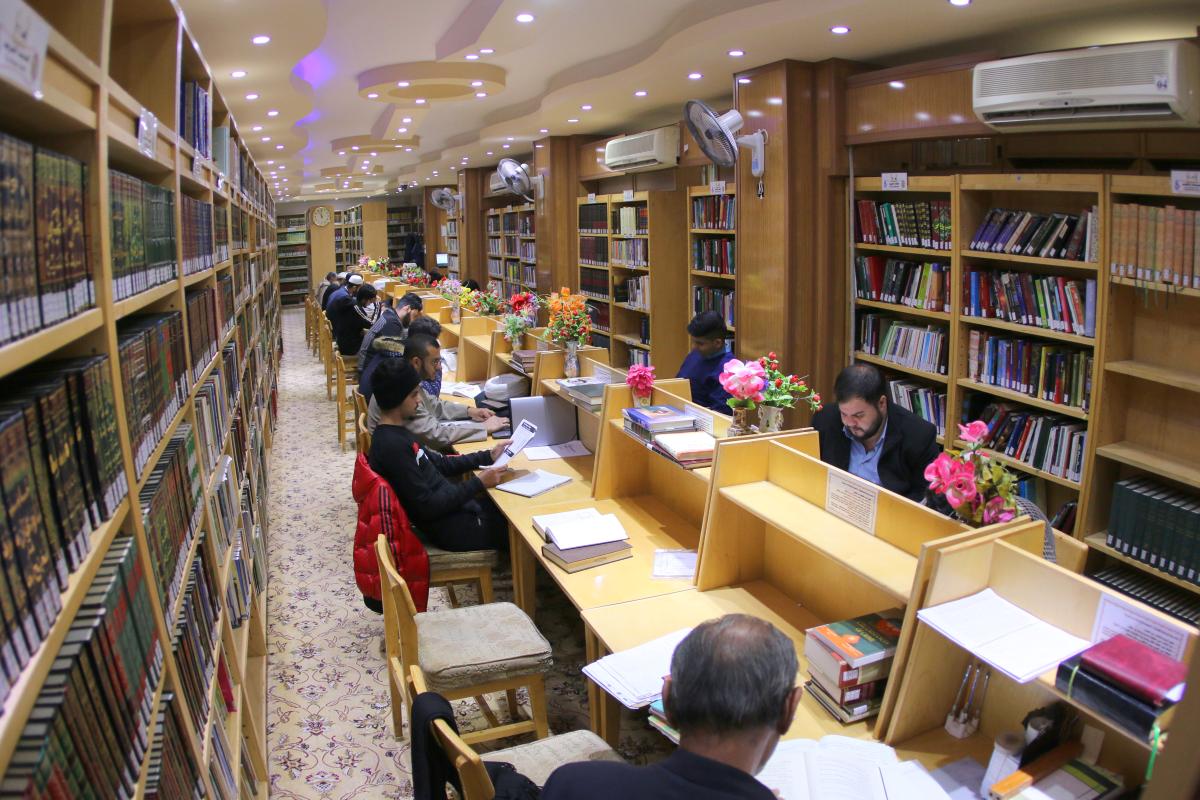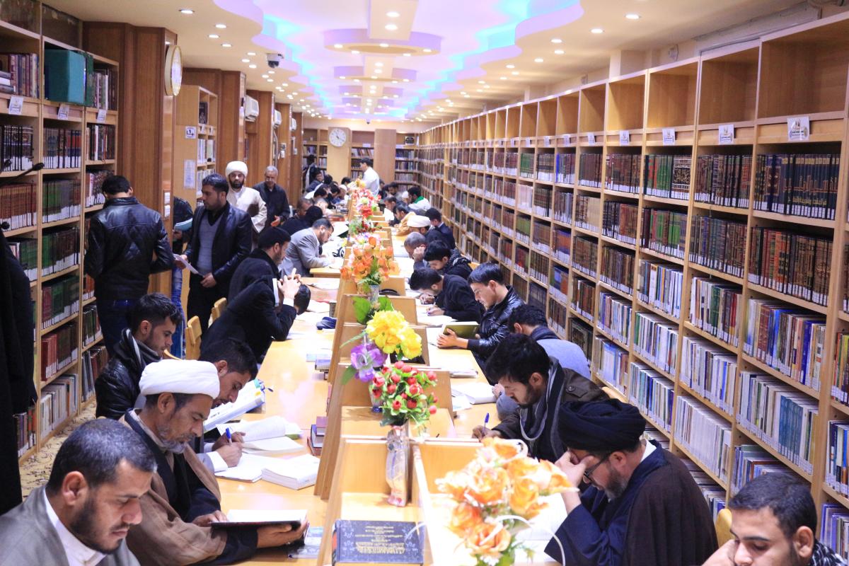 وهي على نحو الرفوف المفتوحة، حيث يكون الكتاب أمام القارئ والباحث مباشرةً ممّا يساعد على سهولة البحث و الاطلاع على الكتب والمصادر الموجودة داخل القاعة - كما أن كتبها رُتِّبَت حسب التصنيف الموضوعي - كالتفسير والمباحث القرآنية، والحديث الشريف، والرجال والتراجم وغيرها من موضوعات المعرفة، علماً إنّ معظم كتب هذه القاعة هي باللغة العربية كما تشتمل على مجموعة من الكتب بالّلغات الأُخرى من قبيل اللغة الفارسية والاردو والانجليزية وغيرها، ويقدر عدد الكتب لكلا القاعتين (قاعة الرجال وقاعة النساء) في الوقت الحاضر (عام 1439 هـ 2018 م) بـ اكثر من (200 ألف) كتاب .